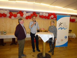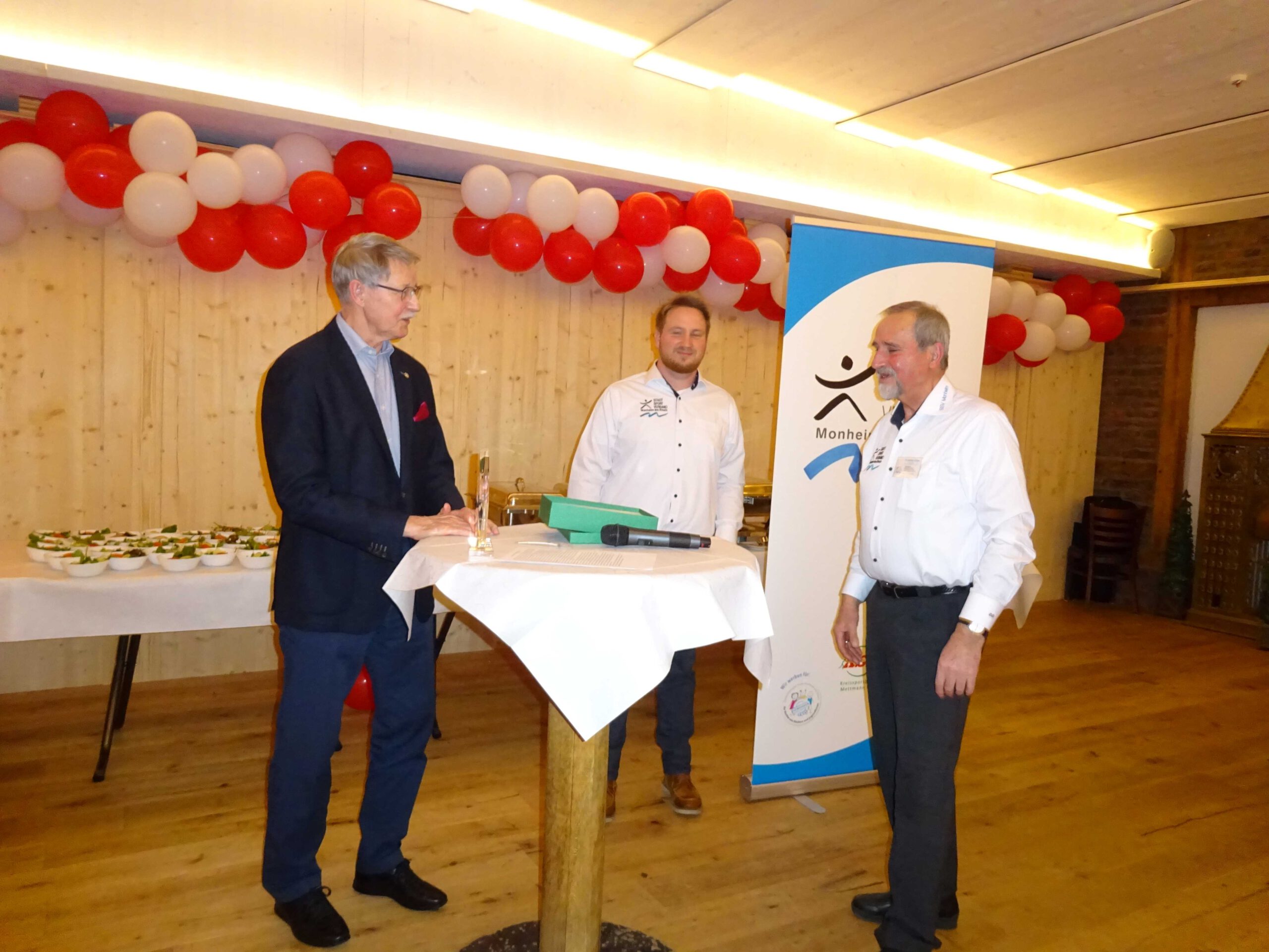 Günter Gast ist seit seiner Jugend dem Schach verbunden. Als Erwachsener trug er schon früh die Jugendarbeit als einem wesentlichem Bestandteil des Schachclubs Monheim/ Baumberg mit, berichtete Daniel Schalow als 1. Vorsitzender in seiner Laudatio. Die erfolgreiche Jugendarbeit zahlte sich im Anwachsen der Mitglieder des Clubs von 21 in 2017 auf derzeit fast 100 aus. G. Gast war und ist „die gute Seele des Vereins“. Er leitete viele Schach-Turniere und organisierte als „Zeremonienmeister“ zusammen mit seiner Frau viele Feiern. Beide Geehrte erhielten eine Stele mit Widmung, und beide Ehefrauen einen Blumenstrauß als Anerkennung für ihr „indirektes ehrenamtliches Engagement“. Im gesellschaftlichen Teil des Abends stärkte man sich am Buffet und pflegte einen regen Kontaktaustausch untereinander, der sich noch lange hinzog.